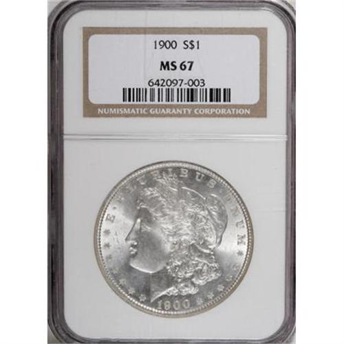 <B>1900 $1 MS67 NGC.</B></I> Here is another opportunity in the present sale to acquire a Superb Gem Morgan dollar. This piece is brilliant with frosty silver luster pristine surfaces. It is sharply struck except for a trace of weakness over Liberty's ear. Census: 28 in 67, 0 finer (10/07).<BR><BR><B>Coin Engraver:</B> George T. Morgan<BR><BR><b>Shipping:</b> Coins & Currency (<a target="_blank" href="http://www.heritageauctions.com/common/shipping.php">view shipping information</a>)