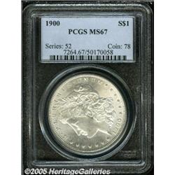 <B>1900<img border='0' src='http://www.heritagecoins.com/images/star.gif' width=10 height=10>$1 MS67 PCGS.</B></I> This gorgeous turn-of-the century Dollar has mark-free surfaces and brilliant surfaces that display thick, frosty luster. This issue is common through the Gem grade, but at the MS67 level this issue becomes a true condition rarity. Population: 13 in 67, 0 finer (1/05).