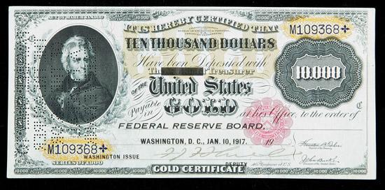 1900, $10,000 Gold Certificate. PCGS Very Choice New 64PPQ. . Fr-1225h. Hole Punch Cancelled. The story of how these cancelled notes survived, being tossed out of a Treasury warehouse during a fire in 1935 and picked up by passersby, is well known in collector circles. Most survivors are apt to show various degrees of damage or staining, and unaffected notes are seldom seen. This beautiful near-Gem is as nice as we've ever seen, with bright paper, bold inks, and no problems whatsoever. Expect spirited bidding for this note, as a more attractive example of this high denomination note might not be found.