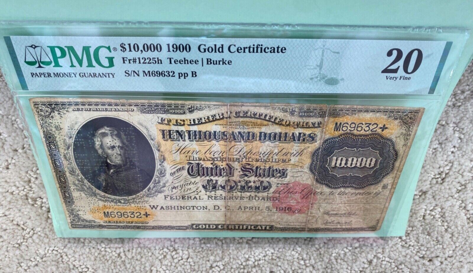 1900 $10,000 TEN THOUSAND DOLLARS U.S. GOLD CERTIFICATE NOTE FR#1225h PMG 20