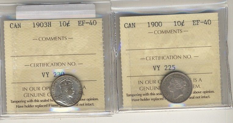 1900 10¢ & 1903H ICCS EF40. Lot of 2 coins.
