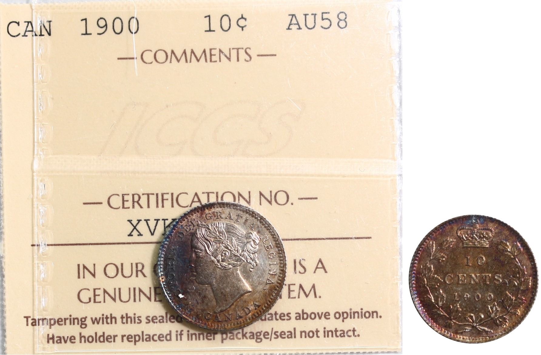 1900 10¢ ICCS Choice About Uncirculated-58 Lustrous with light gold and russet tones.