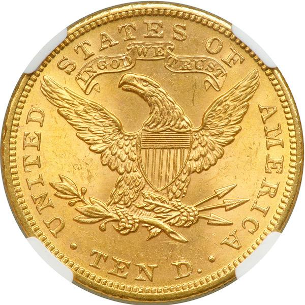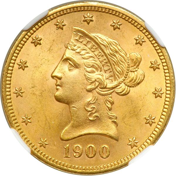 1900 $10 Liberty. NGC graded MS-65. Well struck with nice even toning. This example, illustrative of the gem quality seen in its grade class, has iridescent gold surfaces and no tarnishing. Another thing, this Liberty Eagle also displays a precision strike on the legends and main device, which is always a positive feature for any Liberty Eagle; not even a trace of soft detail at the curls or hair bun, the stars or eagle plumage. Pop 60; 4 finer in 66 (PCGS # 8745) .
