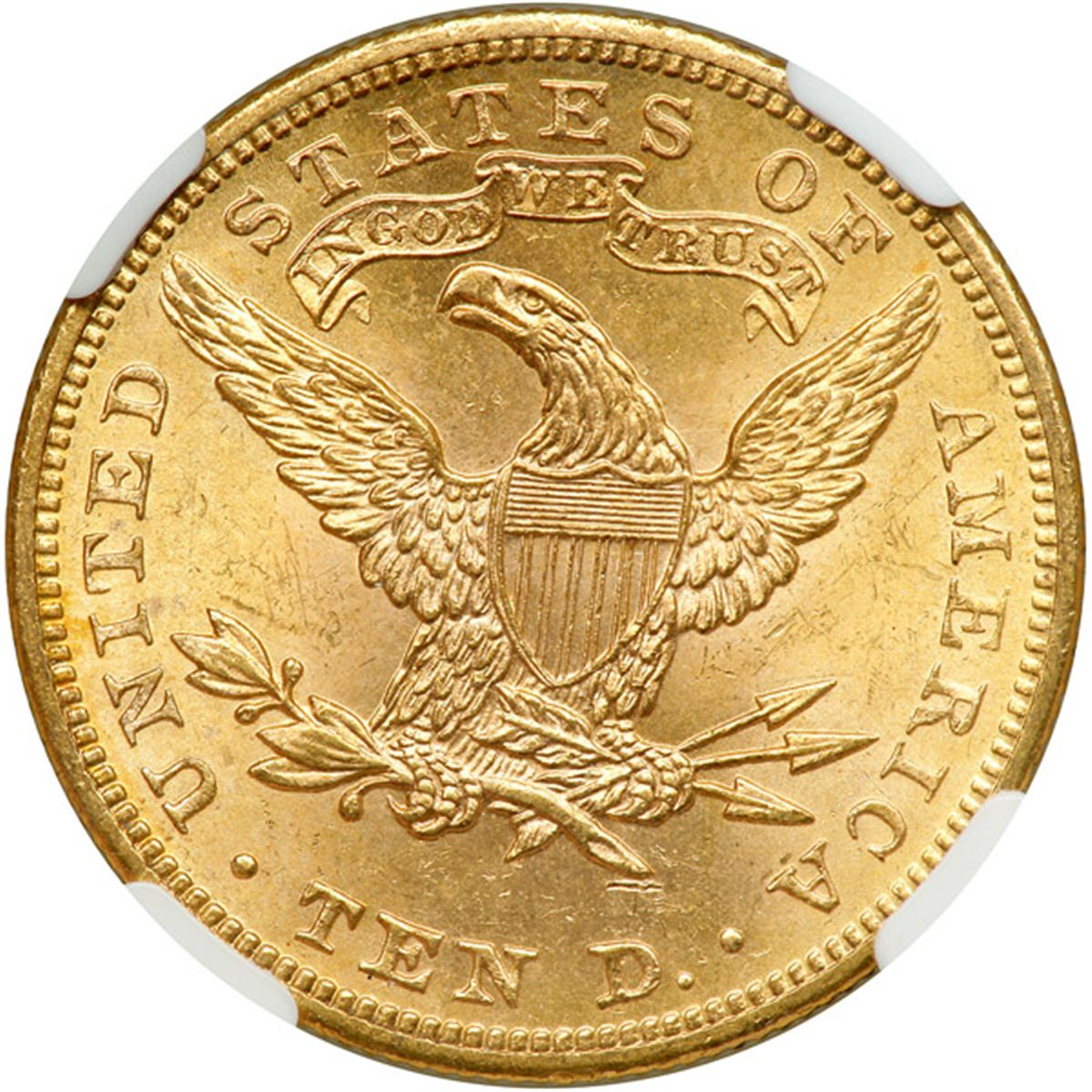 1900 $10 Liberty. NGC graded MS-65. Well struck and frosty with even gold toning on both sides. There is something of an explosion of fine luster here! Readers will notice the velvety to satin-like fields almost stagger under the weight of its highly attractive gold color. A hint of weakness that is sometimes seen on the Liberty series is entirely missing on this razor-sharp specimen, with the key central areas strongly hit by the dies. Pop 60; 4 finer in 66 (PCGS # 8745) .