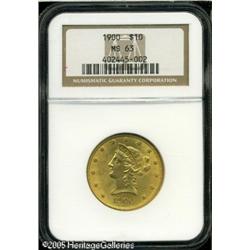 <B>1900 $10 MS63 NGC.</B></I> Set in bright orange-gold with satiny luster over the surfaces. While the grade appears appropriate, the eye appeal is exemplary with the marks that are present being either well disguised within the devices or minimal in size. Lot:8819