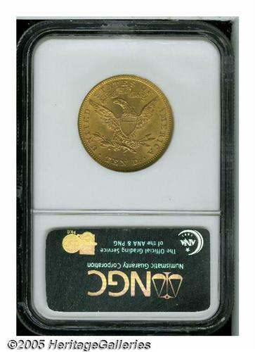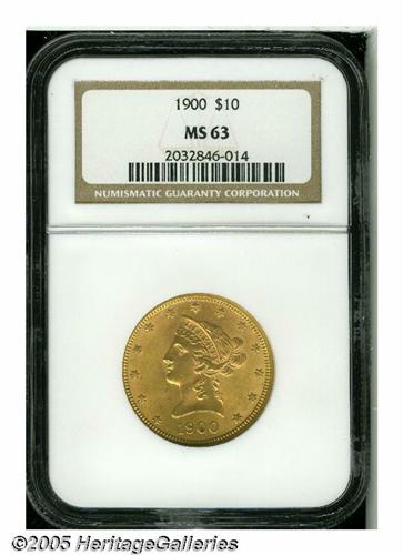 <B>1900<$10> MS63 NGC.</B></I> The design features are well struck, except for the hair above Liberty's ear. The surfaces display peach-gold patina and nice luster. Some minute obverse marks define the grade.<BR><I>From the Dr. Kurt Peters Collection.</B></I> From the Dr. Kurt Peters Collection.