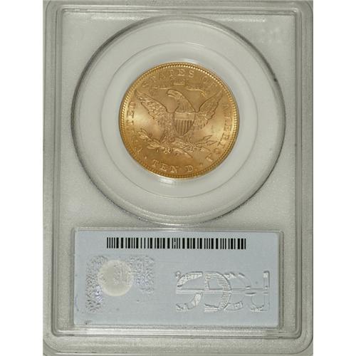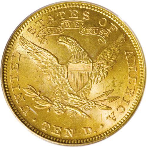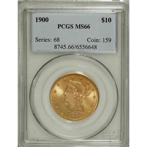 <B>1900 $10 MS66 PCGS.</B></I> While the 1900 eagle is a common date, in Gem condition or finer it is quite rare, and this is the only example certified MS66 at PCGS, with an added three pieces so graded at NGC (3/07). The coin is just what one would expect from a Premium Gem piece, with a generous quota of radiant luster, superlative, virtually mark-free surfaces, and tons of eye appeal. In addition to the clean surfaces, much of the above-mentioned eye appeal is derived from the rich reddish patina that is occasionally interspersed with faint tinges of lilac. A wispy reverse peripheral die crack connects the letter tops at their stress points. The "double-zero" date might also be a plus for a collector wishing to assemble a "creatively different" 1900-2000 type set--or perhaps even an 1800-1900-2000 type set for the truly ambitious (and prosperous) collector. Population: 1 in 66, 0 finer (3/07).<BR><I>From The Palakika Collection.</B></I><BR><BR><b>Shipping:</b> Coins & Currency (<a target="_blank" href="http://www.heritageauctions.com/common/shipping.php">view shipping information</a>)