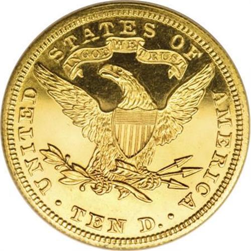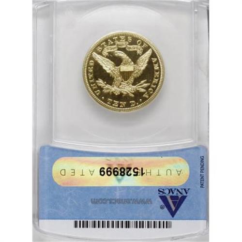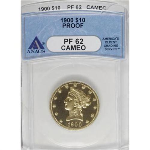 <B>1900 $10 PR62 Cameo ANACS.</B></I> The <I>Guide Book</B></I> reports a mintage of 120 pieces, but unimpaired survivors are significantly rarer, since initial owners or heirs often succumbed to the temptation to spend them. Breen (1988) states "possibly 35 to 40 survive." This needle-sharp specimen exhibits obvious contrast between the radiant devices and the mirrored fields. A loupe reveals delicate field hairlines appropriate for the grade.<BR><BR><b>Shipping:</b> Coins & Currency (<a target="_blank" href="http://www.heritageauctions.com/common/shipping.php">view shipping information</a>)