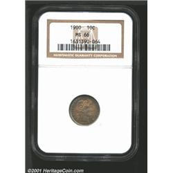 1900 10C MS66 NGC.<p>This gorgeous Gem has iridescent rainbow toning on both sides, with champagne-gold color in the centers that changes to rings of violet, aqua-blue and green patina at the peripheries. Luster blasts through the lovely toning. The strike is complete except for a few grains of wheat in the upper reverse. The surfaces are virtually without abrasions. Population: 2 in 66, 3 finer (9/01). Important notice: We expect to be auctioning lots at the rate of 200-250 per hour. Sometimes eBay Premier live bid software cannot keep up with that pace, so we strongly recommend that you place a realistic proxy bid now as insurance to avoid disappointment. Also please note that all Heritage/CAA lots purchased through eBay Premier carry a 20% Buyer's Premium.