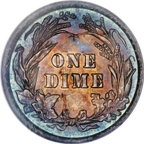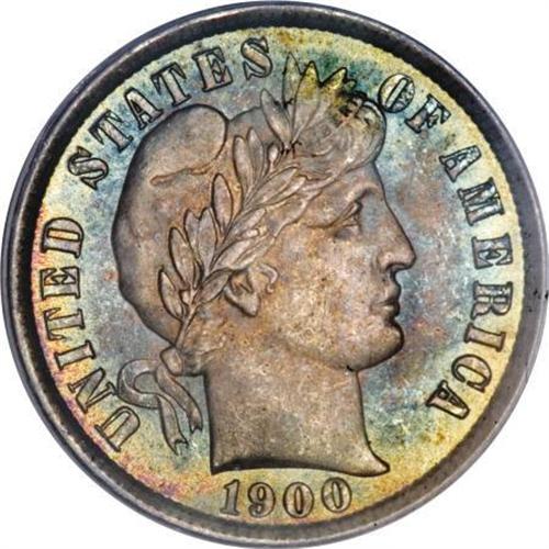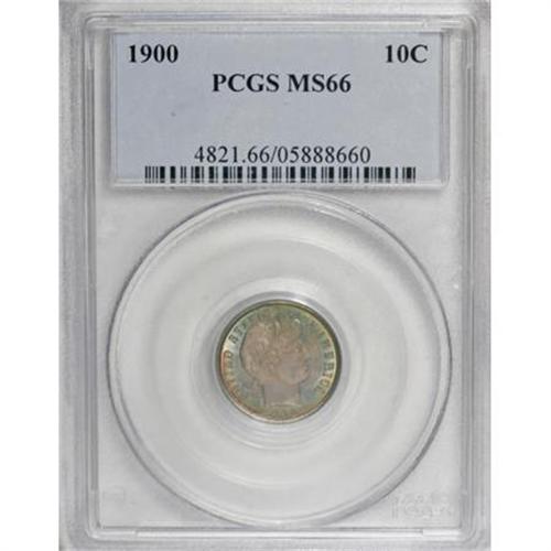 <B>1900 10C MS66 PCGS.</B></I> The toning on this Premium Gem is glamorous, with iridescent veils of pastel pinks, blues, greens and delicate yellows. The reverse toning is especially well-balanced, with rich aquamarine rims blending with silver-pink centers. Clean, satiny, and rarely found any finer. Population: 7 in 66, 4 finer (12/07).<BR><BR><B>Coin Engraver:</B> Charles E. Barber<BR><BR><b>Shipping:</b> Coins & Currency (<a target="_blank" href="http://www.heritageauctions.com/common/shipping.php">view shipping information</a>)