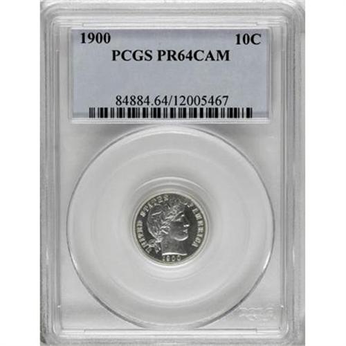 <B>1900 10C PR64 Cameo PCGS.</B></I> Despite minimal frost, both sides of this specimen show contrast between the intense mirrors and the exquisitely struck devices. A few faint hairlines in the fields preclude Gem status. Population: 12 in 64 Cameo, 25 finer (1/08).<BR><BR><b>Shipping:</b> Coins & Currency (<a target="_blank" href="http://www.heritageauctions.com/common/shipping.php">view shipping information</a>)