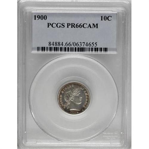 <B>1900 10C PR66 Cameo PCGS.</B></I> This instantly appealing specimen displays untoned centers framed in lovely reddish-orange iridescence. Contrast is especially pronounced. Population: 10 in 66 Cameo, 9 finer (7/07).<BR><BR><b>Shipping:</b> Coins & Currency (<a target="_blank" href="http://www.heritageauctions.com/common/shipping.php">view shipping information</a>\)