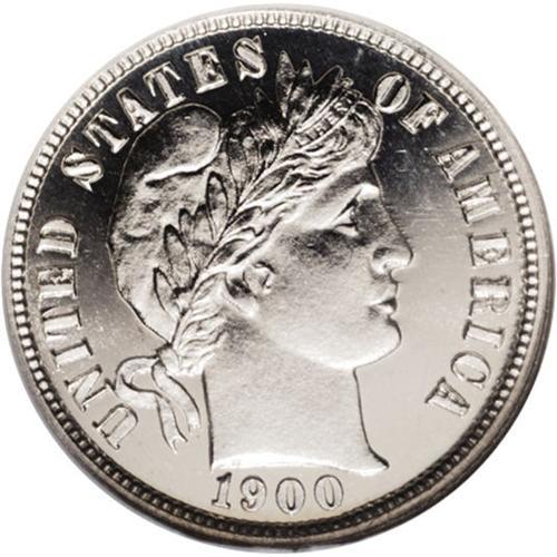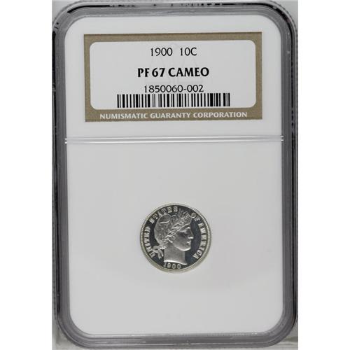 <B>1900<10C> PR67 Cameo NGC.</B></I> Always a popular date with type collectors, this is a wonderful example that is brilliant throughout. The fields are deeply reflective and a significant amount of mint frost is seen over the devices on each side, which gives the coin a noticeable cameo contrast. There are no mentionable contact marks on either side of this Superb type coin. Census: 10 in 67, 4 finer (3/06).
