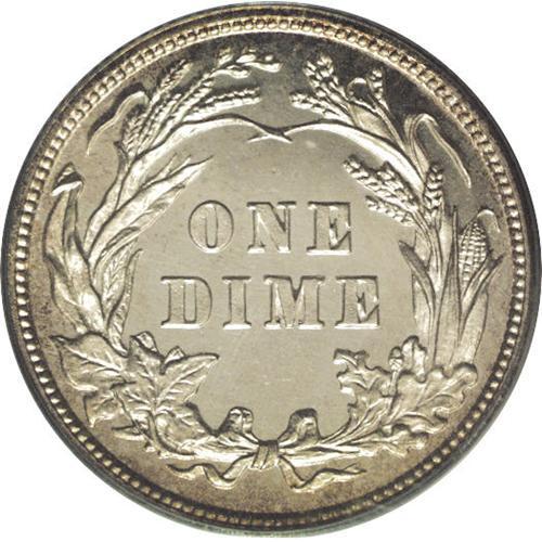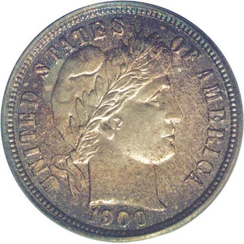 <B>1900<10C> PR67 Cameo PCGS.</B></I> A beautifully toned example, showing deep lilac, gold-brown, and cobalt-blue around the obverse periphery framing the near-brilliant center. The reverse sports faint peripheral gold-tan toning around an essentially untoned center. The design elements are crisply impressed throughout, and reveal a strong contrast with the deeply mirrored fields. The surfaces are virtually perfect, revealing no significant contact marks. Population: 5 in 67, 2 finer (4/06).