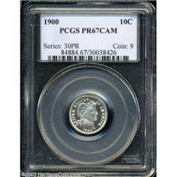 <table><tr><td><TABLE cellSpacing=0 cellPadding=0 width="100%" bgColor=#000000 border=0><TBODY> <TR><TD width="100%"><TABLE cellSpacing=1 cellPadding=3 width="100%" border=0><TBODY><TR><TD width="100%" bgColor=#79735c><FONT face=arial color=#ffffff size=3><B>Description</B> </FONT></TD></TR><TR><TD width="100%" bgColor=#ffffff><FONT face=arial size=2><B>1900 10C PR67 Cameo PCGS.</B></I> An untoned Superb Gem proof Barber dime with a pronounced black and white contrast between the frosty devices and the watery fields. Only 912 proofs were originally struck, and very few examples can claim this elevated numerical grade. A flashy coin that would be an impressive addition to a proof type set. </FONT></TD></TR></TBODY></TABLE></TD></TR></TBODY></TABLE><BR><A name=PricesRealized></A><TABLE cellSpacing=0 cellPadding=0 width="100%" bgColor=#000000 border=0><TBODY><TR><TD width="100%"><TABLE cellSpacing=1 cellPadding=3 width="100%" border=0><TBODY><TR><TD width="100%" bgColor=#79735c><A name=PR><FONT face=arial color=#ffffff size=3><B>Previous Prices from Heritage Auctions</B> </FONT></A></TD></TR><TR><TD bgColor=#f6f6ed><TABLE cellSpacing=0 cellPadding=0 width="100%" border=1><TBODY><TR><TD align=middle width="33%"><B>Date</B></TD><TD align=middle width="33%"><B>Service</B></TD><TD align=middle width="33%"><B>Price</B></TD></TR><TR bgColor=whitesmoke><TD width="33%"><B>05/31/2001</B></TD><TD width="33%">NGC</TD><TD width="33%">$3,162.50</TD></TR></TBODY></TABLE></TD></TR><TR><TD bgColor=#ffffff><FONT face=arial size=1 ?>PLEASE NOTE: All prices realized reflect the final hammer price PLUS the buyer's premium in auctions that charge a buyer's premium. Each item has a notation at the top of the listing indicating whether that lot included a buyer's premium. Example: A item that sells with a final hammer price of $100 and a 20% buyer's premium will display with a price realized of $120. All information listed is intended to be as accurate as possible, but errors are possible. Please use this guide carefully and inform us of any inaccuracies. </FONT></TD></TR></TBODY></TABLE></TD></TR></TBODY></TABLE><BR><TABLE cellSpacing=0 cellPadding=0 width="100%" bgColor=#000000 border=0><TBODY><TR><TD width="100%"><TABLE cellSpacing=1 cellPadding=3 width="100%" border=0><TBODY><TR><TD width="100%" bgColor=#79735c colSpan=6><FONT face=arial color=#ffffff size=3><B>Price Guide*</B> </FONT></TD></TR><TR bgColor=#f6f6ed><TD align=middle><B>Grade</B> </TD><TD align=middle><B>Coin World<BR>(Trends)</B> </TD><TD align=middle><B>Numismedia<BR>Retail</B> </TD><TD align=middle><B>Numismedia<BR>Wholesale</B> </TD><TD align=middle><B>Coin<BR>Universe</B> </TD><TD align=middle><B>Heritage<BR>Value Index</B> </TD></TR><TR bgColor=#ffffff><TD align=middle>66</TD><TD align=right>---</TD><TD align=right>---</TD><TD align=right>---</TD><TD align=right>---</TD><TD align=right>---</TD></TR><TR style="FONT-WEIGHT: bold" bgColor=#cccfdd><TD align=middle>67</TD><TD align=right>---</TD><TD align=right>---</TD><TD align=right>---</TD><TD align=right>---</TD><TD align=right>---</TD></TR><TR bgColor=#ffffff><TD align=middle>68</TD><TD align=right>---</TD><TD align=right>---</TD><TD align=right>---</TD><TD align=right>---</TD><TD align=right>---</TD></TR><TR bgColor=#ffffff><TD colSpan=6><FONT size=1>*All information listed is intended to be as accurate as possible, but errors are possible. No item may be returned or refused based on this information which is provided as a service to our customers. You should contact each pricing source directly to determine the accuracy of this information. </FONT></TD></TR></TBODY></TABLE></TD></TR></TBODY></TABLE><BR><TABLE cellSpacing=0 cellPadding=0 width="100%" bgColor=#000000 border=0><TBODY><TR><TD width="100%"><TABLE cellSpacing=1 cellPadding=3 width="100%" border=0><TBODY><TR><TD width="100%" bgColor=#79735c><FONT face=arial color=#ffffff size=3><B>Population Guide</B> </FONT></TD></TR><TR bgColor=#ffffff><TD align=middle><!-- Begin Output of Population Grid--><TABLE cellSpacing=0 cellPadding=0 width="100%" border=0><TBODY><TR><TD vAlign=center><TABLE cellSpacing=0 width="100%" border=1 cellsadding="3"><TBODY><TR><TD vAlign=center><TABLE cellSpacing=0 cellPadding=3 width="100%" border=1><TBODY><TR><TD vAlign=center align=middle bgColor=#f0f1e8 colSpan=2 <CENTER><FONT face=Arial size=2><B>PCGS Pop </B></FONT><CENTER></CENTER></TD><TD vAlign=center align=middle bgColor=#f0f1e8 colSpan=2><CENTER><FONT face=Arial size=2><B>NGC Pop</B></CENTER></FONT></TD></TR><TR><TD vAlign=center><FONT face=Arial size=2>(67)</FONT> </TD><TD vAlign=center align=right><FONT face=Arial size=2>1</FONT> </TD><TD vAlign=center><FONT face=Arial size=2>(67)</FONT> </TD><TD vAlign=center align=right><FONT face=Arial size=2>9</FONT> </TD></TR><TR><TD vAlign=center><FONT face=Arial size=2>(>67)</FONT> </TD><TD vAlign=center align=right><FONT face=Arial size=2>0</FONT> </TD><TD vAlign=center><FONT face=Arial size=2>(>67)</FONT> </TD><TD vAlign=center align=right><FONT face=Arial size=2>2</FONT> </TD></TR></TBODY></TABLE></TD></TR></TBODY></TABLE></TD></TR></TBODY></TABLE><!-- End Output of Population Grid--></TD></TR></TBODY></TABLE></TD></TR></TBODY></TABLE><BR><TABLE cellSpacing=0 cellPadding=0 width="100%" bgColor=#000000 border=0><TBODY><TR> Important notice: Heritage usually auctions material at the rate of 200-250 lots per hour. On some occasions eBay Live bid software or the Internet may not be able to keep up with the pace of the auction. We recommend placing a realistic absentee bid now as insurance to avoid disappointment. Occasionally the auctioneer may eliminate or reject an eBay Live bid, and the auctioneer may also reopen a lot after the close of the eBay live bidding (usually because we missed an audience bid), and may reject your bid even if it shows you as the winning bidder. By bidding via eBay Live, you agree that Heritage may award the lot to another bidder at its sole discretion under the circumstances des