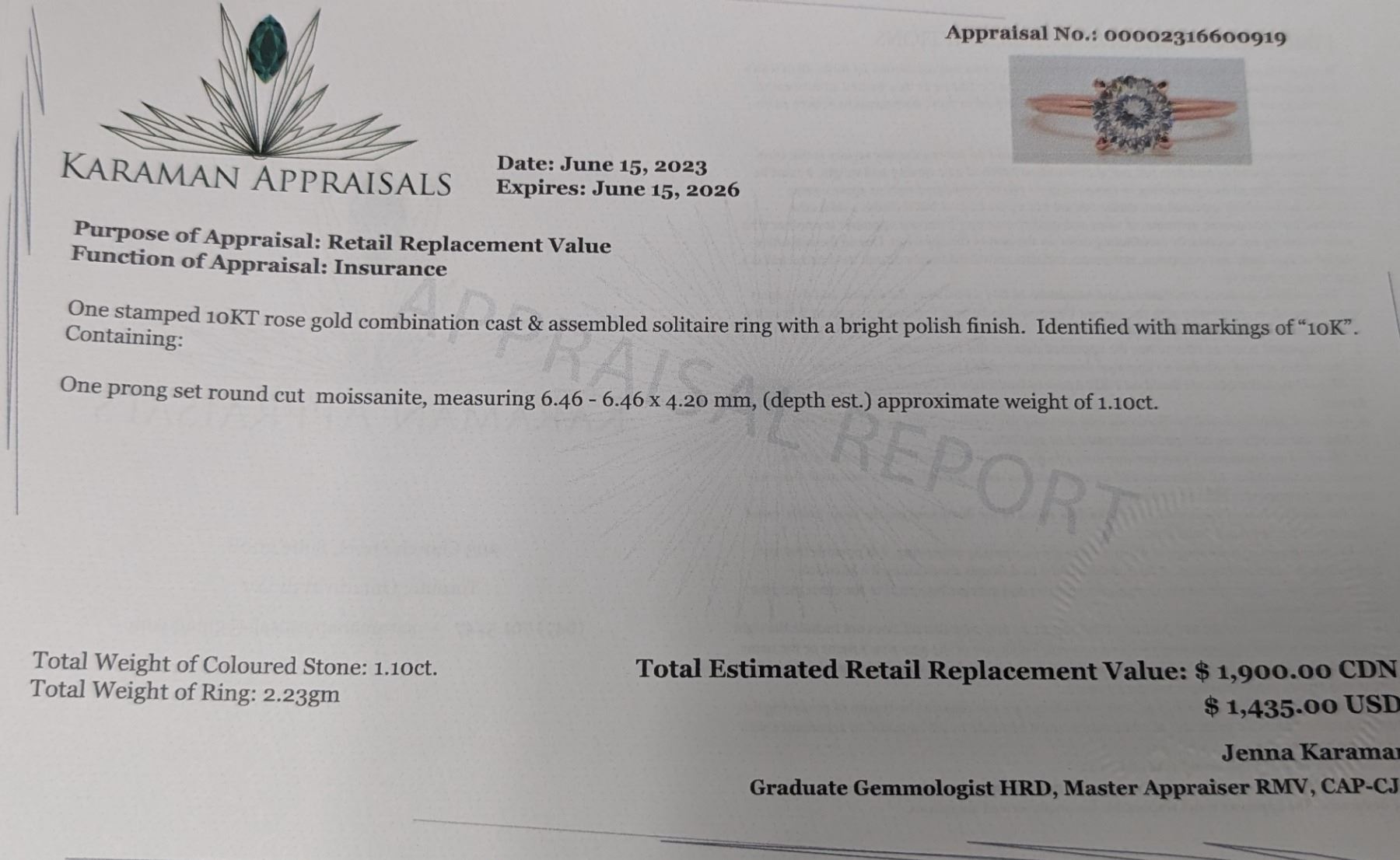 $1900, 10K(2.38g), MOISSANITE (1.1ct) RING, appraised value $1900