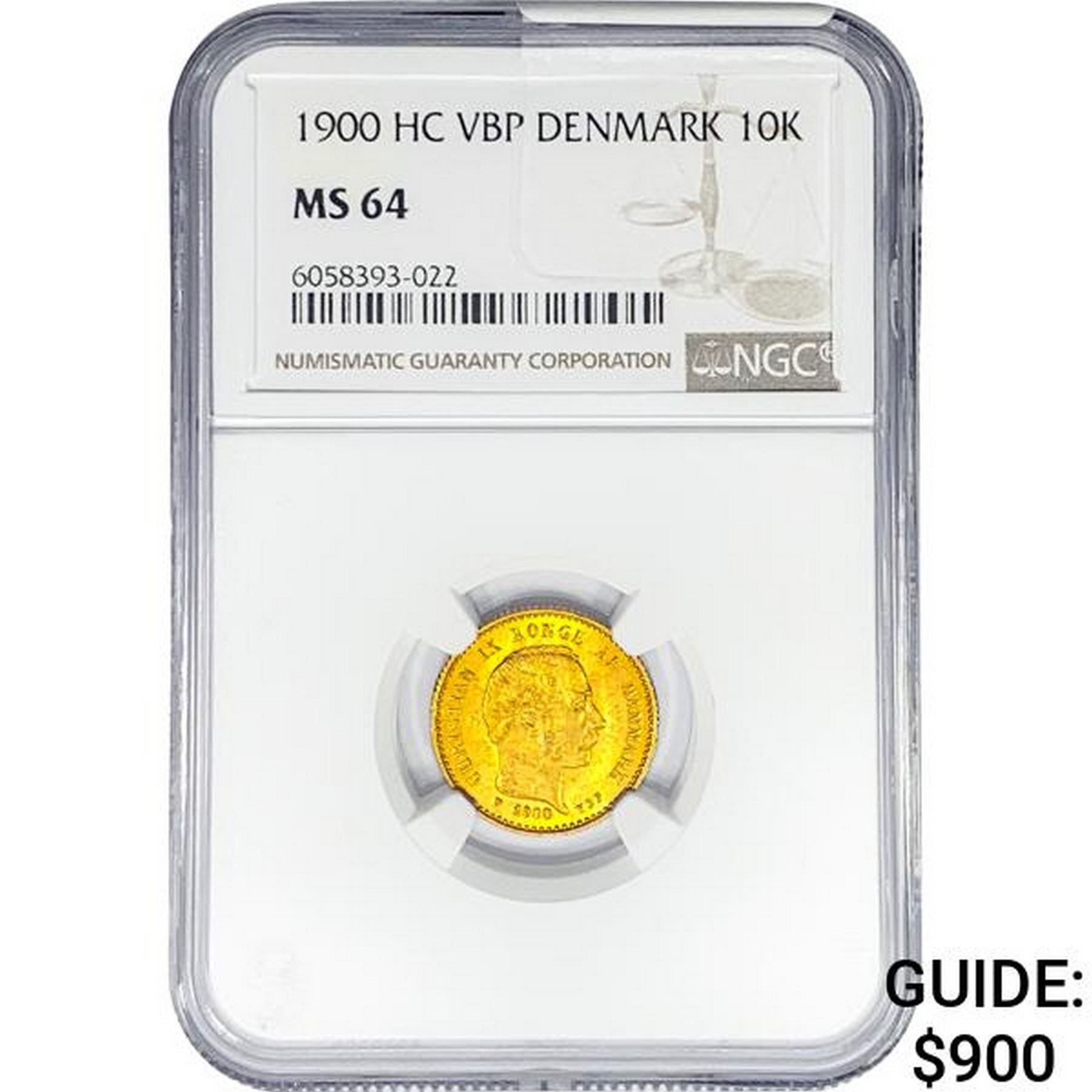 1900 .1296oz. Gold HC VBP Denmark 10 Kroner NGC MS