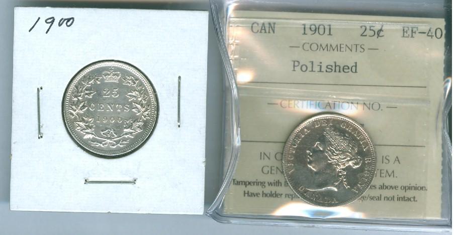 1900 & 1901 25¢. Lot of two coins both EF in grade and lightly polished. The 1901 is ICCS graded and designated as Polished.