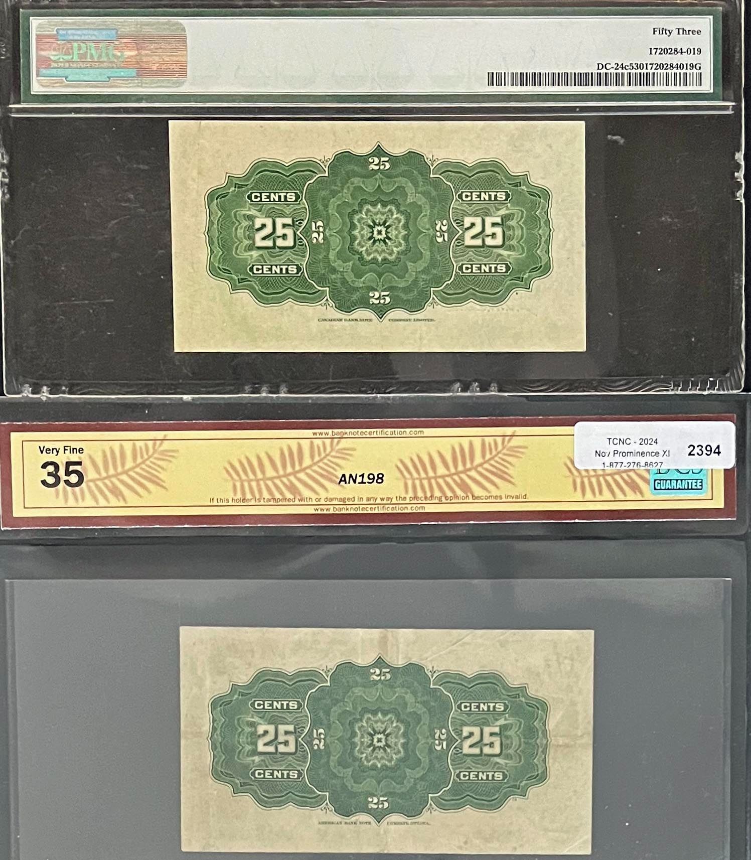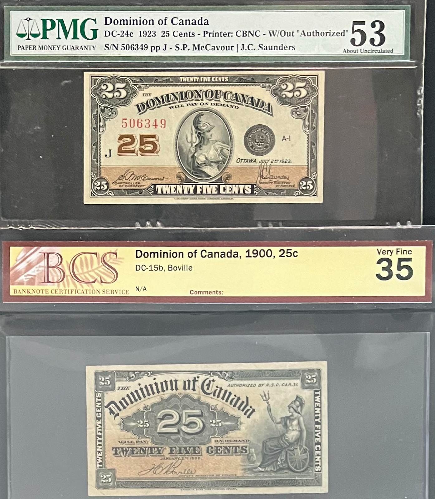 1900-1923 25¢ Shinplasters DC-15b BCS VF35 & DC-24c PMG AU53. Lot of 2 notes.