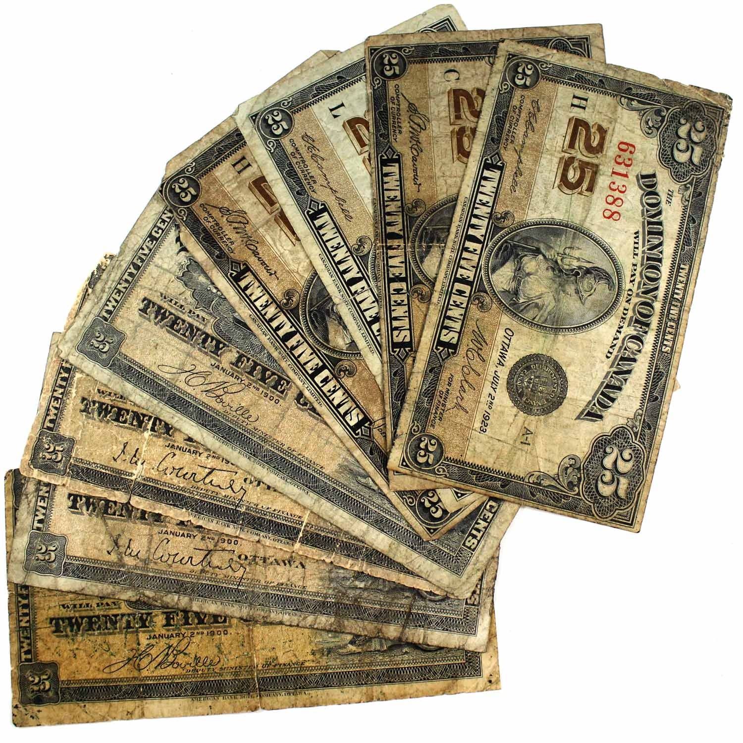 1900 & 1923 25-cent Shinplaster Dominion of Canada Banknotes. You will receive 4x 1923 & 4x 1900. 8pcs