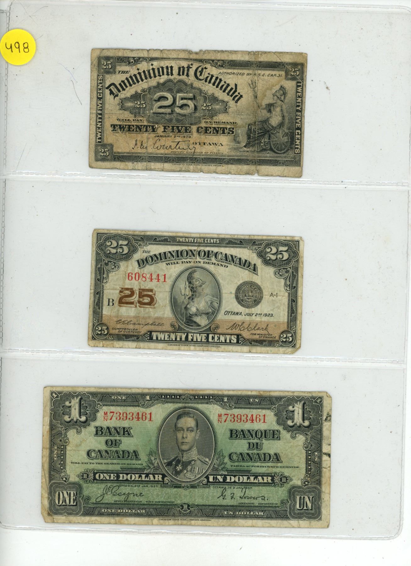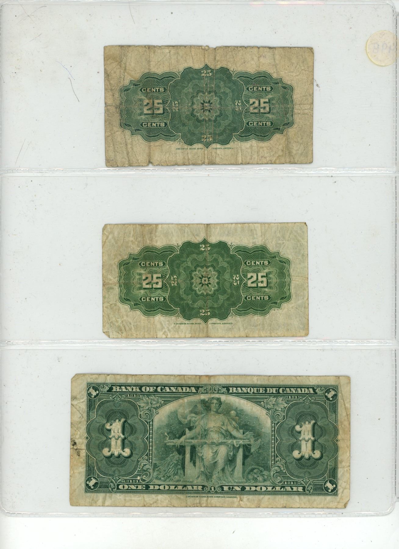 1900, 1923 Canadian 25 Cents Shinplaster and 1937 Canadian One Dollar.