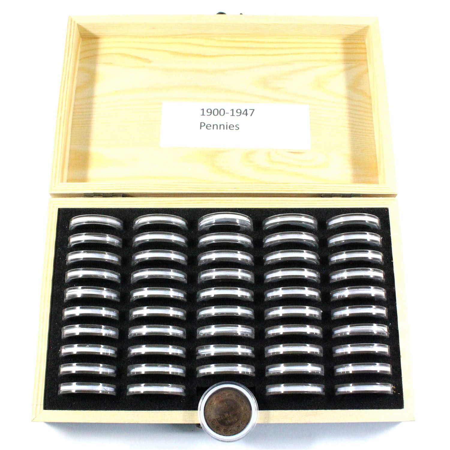 1900-1947 Canada 1-cent Collection, One of Every Date Including Key Dates 1922-1926. The coins in this set are individually encapsulated in foam inside of a nice "H F Coin Collection" wooden box.