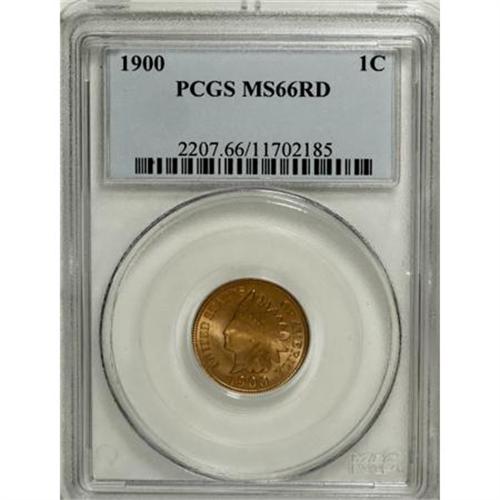 <B>1900 1C MS66 Red PCGS.</B></I> A superior type coin. Both sides show even, orange-red color and thick mint frost. There is a touch of softness at the end of the upper feathers of the headdress, but the remainder of the coin is fully detailed. A wonderful turn-of-the-century type coin. Population: 56 in 66, 6 finer (8/07).<BR><BR><B>Coin Engraver:</B> James B. Longacre<BR><BR><b>Shipping:</b> Coins & Currency (<a target="_blank" href="http://www.heritageauctions.com/common/shipping.php">view shipping information</a>)