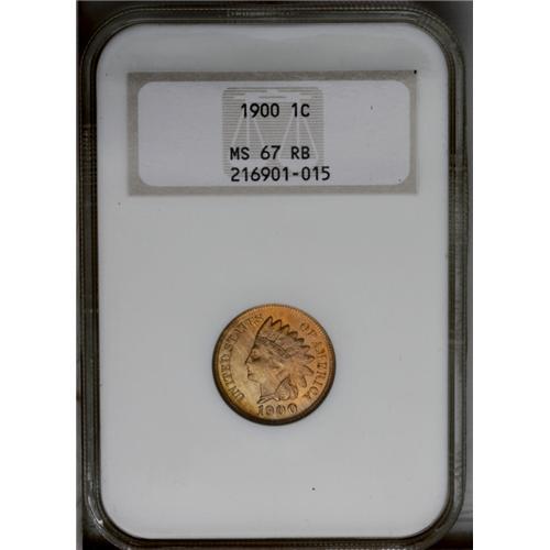 <B>1900<1C> MS67 Red and Brown NGC.</B></I> The obverse appears to be right on the cusp of a full red designation while blushes of amber and violet toning on the left side of the reverse dash any hopes of a Gem Red rating. Well defined and displaying outstanding eye appeal. Census: 2 in 67, 0 finer (3/06). <BR><BR><B>Important notice:</B> Heritage usually auctions material at the rate of 200-250 lots per hour. On some occasions eBay Live bid software or the Internet may not be able to keep up with the pace of the auction. We recommend placing a realistic absentee bid now as insurance to avoid disappointment. Occasionally the auctioneer may eliminate or reject an eBay Live bid, and the auctioneer may also reopen a lot after the close of the eBay live bidding (usually because we missed an audience bid), and may reject your bid even if it shows you as the winning bidder. By bidding via eBay Live, you agree that Heritage may award the lot to another bidder at its sole discretion under the circumstances described above or any other reasonable circumstances. Since eBay bids are not shown to us until we open the lot on the floor, we treat those bids just like floor bids. In most cases the floor responds before the eBay bid is presented to us, due to Internet lag time, so for consistency we have made it a policy that floor bids are always considered first over tie eBay live bids. Also please note that all Heritage lots purchased through eBay Live carry a 20% Buyer's Premium. Please make sure you read the Terms and Conditions before you bid. This lot is being auctioned in conjunction with a live floor auction by Heritage Galleries & Auctioneers. All final auction and invoice information will be supplied by Heritage Galleries & Auctioneers, and all other information should be considered preliminary. Lot:416 <BR><BR><B>Winning Notification and Billing:</B> After the FINAL session in this auction is complete, Heritage will send e-mail and snail mail invoices. This process normally takes several days. All final auction and invoice information will be supplied by Heritage Galleries & Auctioneers, and all other information should be considered preliminary. <BR><BR>This auction will be conducted on a live auction floor and over the Internet through eBay Live. If you choose to place an absentee bid, please take a moment to <font color='#0000ff'><u><a href='http://pages.ebay.com/liveauctions/help/before/laabsentee.html'>learn how eBay Live absentee bidding works</a></u></font><font color='#000000'>