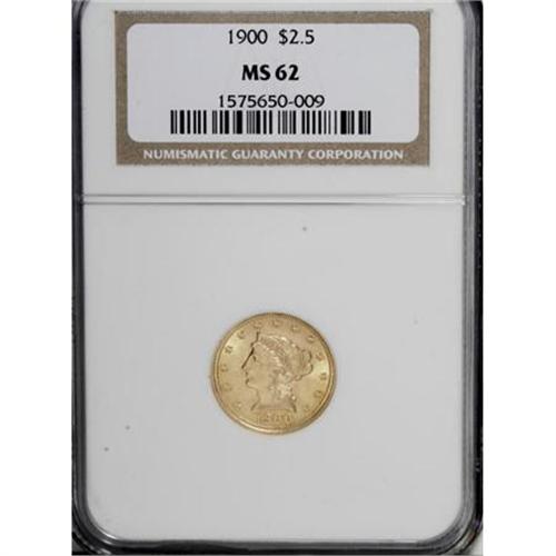 <B>1900 $2 1/2 MS62 NGC.</B></I> NGC Census: (323/897). PCGS Population (285/843). Mintage: 67,000. Numismedia Wsl. Price for NGC/PCGS coin in MS62: $455. (#7852)<BR><BR><B>Coin Engraver:</B> Christian Gobrecht<BR><BR><b>Shipping:</b> Coins & Currency (<a target="_blank" href="http://www.heritageauctions.com/common/shipping.php">view shipping information</a>\)