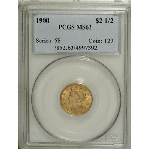 <B>1900 $2 1/2 MS63 PCGS.</B></I> PCGS Population (378/489). NGC Census: (319/598). Mintage: 67,000. Numismedia Wsl. Price for NGC/PCGS coin in MS63: $725. (#7852)<BR><BR><B>Coin Engraver:</B> Christian Gobrecht<BR><BR><b>Shipping:</b> Coins & Currency (<a target="_blank" href="http://www.heritageauctions.com/common/shipping.php">view shipping information</a>)