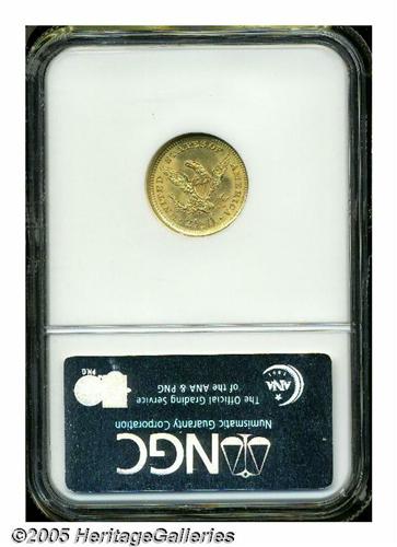 <B>1900<$2 1/2> MS66 NGC.</B></I> With a mintage of 67,000 business strikes, this quarter becomes difficult in the better grades of Uncirculated. NGC and PCGS combined have seen only 21 pieces grading finer (5/05) than the Premium Gem offered in this lot. Its smooth, silky surfaces display glowing luster and warm peach-gold patina, and the design features are exquisitely struck. The obverse is flawless; a couple of minute handling marks in the right (facing) reverse field are mentioned for accuracy. A truly great coin that will fit exceptionally well into an advanced gold collection.