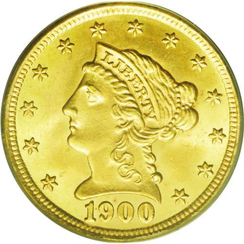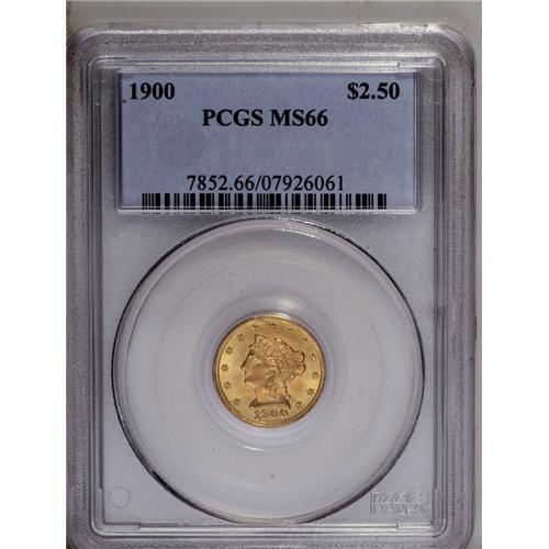 <B>1900<$2 1/2> MS66 PCGS.</B></I> A highly lustrous Gem with frosty yellow-gold surfaces and orange accents. It is an attractive example that will please the connoisseur. A few tiny ticks on each side keep it from the elusive Superb Gem grade category. Population: 52 in 66, 4 finer (6/06).
