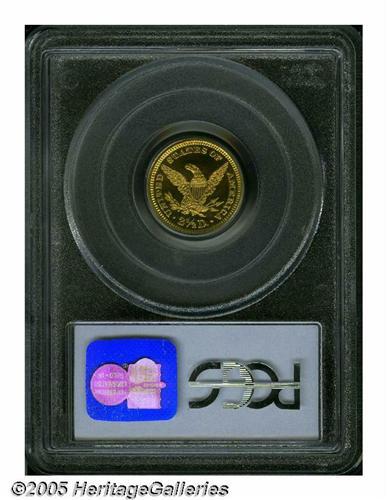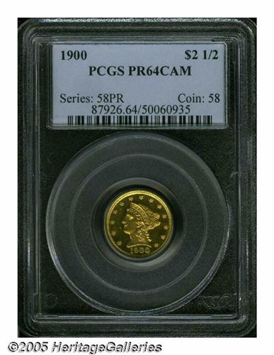 <B>1900<$2 1/2> PR64 Cameo PCGS.</B></I> The base of the 19 in the date is lightly repunched, and a die line below the T in LIBERTY verifies a second proof diagnostic mentioned in Breen's <I>Encyclopedia.</B></I> The strike is seemingly unimprovable, and the preservation is imposing. Although business strikes for this year were saved in quantity, unimpaired proofs with a strong Cameo contrast are rare. Population: 5 in 64 Cameo, 4 finer (6/05).