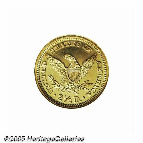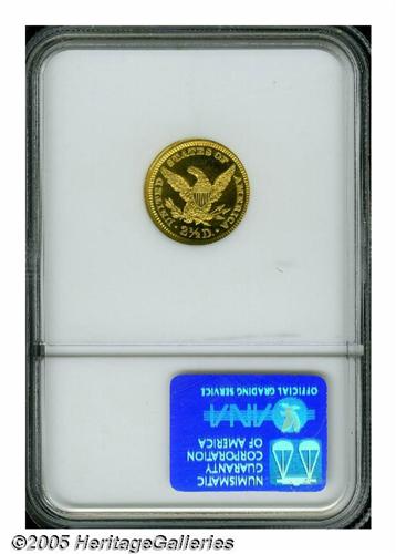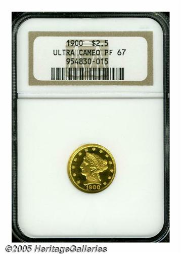 <B>1900<$2 1/2> PR67 Deep Cameo NGC.</B></I> This coin is very bright with abundant frost on the devices, particularly so on Liberty's face. The fields delight the viewer with their mirror quality and retain all the freshness imparted by the dies. These proofs were struck very carefully so that even the tiniest recesses of the dies were brought out by each coin, hence Liberty's hair curls are piled high, the central star points crisp and sharp, and the eagle's feathers fully present. Such exceptional quality represents a high water mark for American coining techniques, and coupled with the extraordinary Ultra Cameo contrast and Superb Gem Proof grade, this is a coin which any collector will always desire. Remarkably, from the paltry mintage of 205 quarter eagle proofs struck in 1900, a fair number show the Ultra Cameo contrast. NGC in their Census reports that nine examples have been graded this high, with an additional seven coins seen in finer grades. This particular coin is identifiable by a lint mark which extends down from the inside lower point of star eleven to the rim below and by a very minor chatter mark extending up from the first inside star point toward Liberty's chin. On the die diagnostics we note a small engravers line which extends below the center upright of the T in LIBERTY toward Liberty's ear. Certainly an impressive and exciting coin for the numismatist to aspire to own.