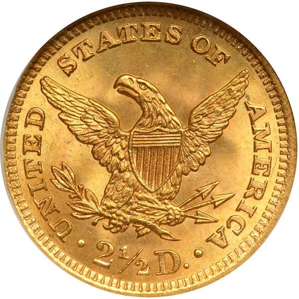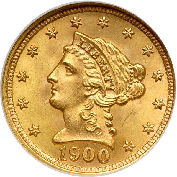 1900 $2.50 Liberty. NGC graded MS-66. A hint of light tone. An appealing gem. Pop 108; 31 finer, 1 in 66 Star, 27 in 67, 2 in 67 Star, and 1 in 68 (PCGS # 7852) .