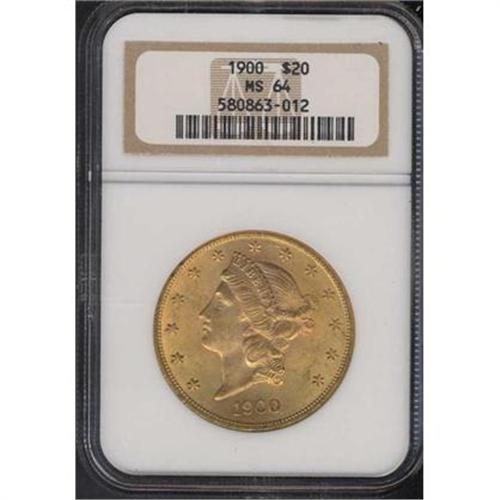 <b>1900 $20 Liberty. NGC graded MS64.</b> Likely a early strike from fresh dies, just estimating from the details. The surfaces are vivid gold in hue and drenched in luster with pinkish rose toning adding to the allure <b>(PCGS # 9037)</b> <i>
