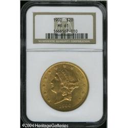 1900 $20 MS61 NGC. A crisp Liberty Twenty with ful <B>1900 $20 MS61 NGC.</B></I> A crisp Liberty Twenty with full mint luster and a clean appearance, despite a minor rim ding at 4:30 on the reverse. <BR><BR><B>Important notice:</B> Heritage usually auctions material at the rate of 200-250 lots per hour. On some occasions eBay Live bid software or the Internet may not be able to keep up with the pace of the auction. We recommend placing a realistic absentee bid now as insurance to avoid disappointment. Occasionally the auctioneer may eliminate or reject an eBay Live bid, and the auctioneer may also reopen a lot after the close of the eBay live bidding (usually because we missed an audience bid), and may reject your bid even if it shows you as the winning bidder. By bidding via eBay Live, you agree that Heritage may award the lot to another bidder at its sole discretion under the circumstances described above or any other reasonable circumstances. Since eBay bids are not shown to us until we open the lot on the floor, we treat those bids just like floor bids. In most cases the floor responds before the eBay bid is presented to us, due to Internet lag time, so for consistency we have made it a policy that floor bids are always considered first over tie eBay live bids. Also please note that all Heritage lots purchased through eBay Live carry a 20% Buyer's Premium. Please make sure you read the Terms and Conditions before you bid. This lot is being auctioned in conjunction with a live floor auction by Heritage Galleries & Auctioneers. All final auction and invoice information will be supplied by Heritage Galleries & Auctioneers, and all other information should be considered preliminary. Lot:7000