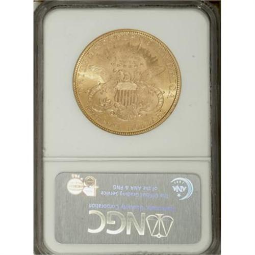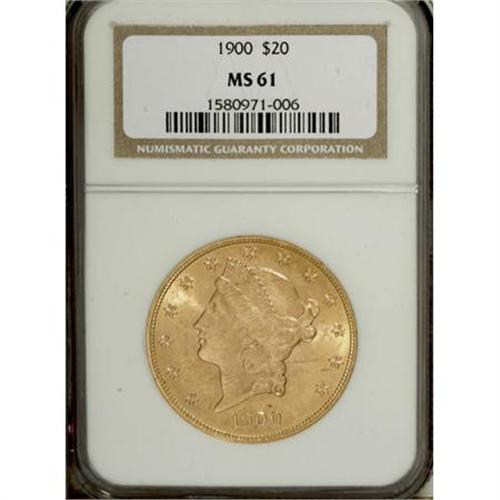 <B>1900 $20 MS61 NGC.</B></I> NGC Census: (4850/23499). PCGS Population (3291/18431). Mintage: 1,874,584. Numismedia Wsl. Price for NGC/PCGS coin in MS61: $715. (#9037)<BR><BR><B>Coin Engraver:</B> James B. Longacre<BR><BR><b>Shipping:</b> Coins & Currency (<a target="_blank" href="http://www.heritageauctions.com/common/shipping.php">view shipping information</a>)