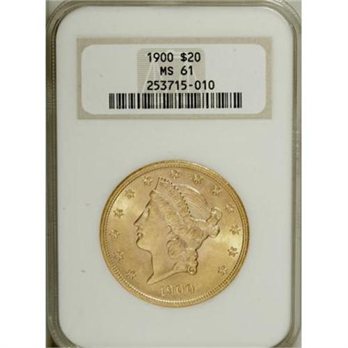 <B>1900 $20 MS61 NGC.</B></I> NGC Census: (4850/23499). PCGS Population (3291/18431). Mintage: 1,874,584. Numismedia Wsl. Price for NGC/PCGS coin in MS61: $715. (#9037)<BR><BR><B>Coin Engraver:</B> James B. Longacre<BR><BR><b>Shipping:</b> Coins & Currency (<a target="_blank" href="http://www.heritageauctions.com/common/shipping.php">view shipping information</a>)