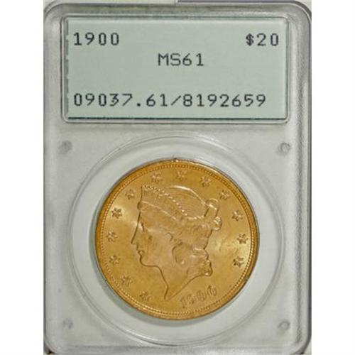 <B>1900 $20 MS61 PCGS.</B></I> PCGS Population (3313/18996). NGC Census: (4903/23787). Mintage: 1,874,584. Numismedia Wsl. Price for NGC/PCGS coin in MS61: $705. (#9037)<BR><BR><B>Coin Engraver:</B> James B. Longacre<BR><BR><b>Shipping:</b> Coins & Currency (<a target="_blank" href="http://www.heritageauctions.com/common/shipping.php">view shipping information</a>)