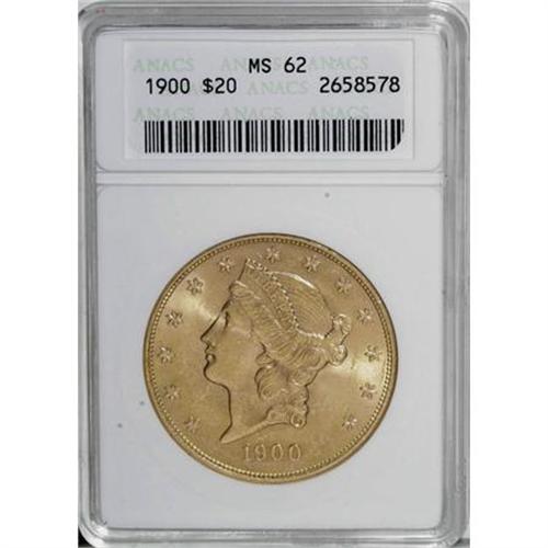 <B>1900 $20 MS62 ANACS.</B></I> NGC Census: (11164/12186). PCGS Population (8973/9052). Mintage: 1,874,584. Numismedia Wsl. Price for NGC/PCGS coin in MS62: $755. (#9037)<BR><BR><B>Coin Engraver:</B> James B. Longacre<BR><BR><b>Shipping:</b> Coins & Currency (<a target="_blank" href="http://www.heritageauctions.com/common/shipping.php">view shipping information</a>\)