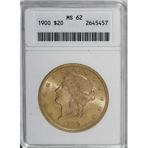 <B>1900 $20 MS62 ANACS.</B></I> NGC Census: (11164/12186). PCGS Population (8973/9052). Mintage: 1,874,584. Numismedia Wsl. Price for NGC/PCGS coin in MS62: $755. (#9037)<BR><BR><B>Coin Engraver:</B> James B. Longacre<BR><BR><b>Shipping:</b> Coins & Currency (<a target="_blank" href="http://www.heritageauctions.com/common/shipping.php">view shipping information</a>\)