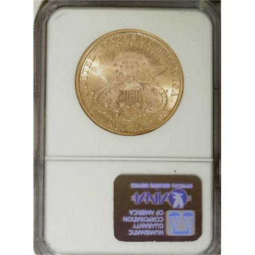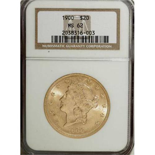 <B>1900 $20 MS62 NGC.</B></I> Sharply struck with vibrantly lustrous straw-gold fields and equally pale devices. While the obverse has sustained a number of abrasions, the reverse is clean for the grade.<BR><BR><B>Coin Engraver:</B> James B. Longacre<BR><BR><b>Shipping:</b> Coins & Currency (<a target="_blank" href="http://www.heritageauctions.com/common/shipping.php">view shipping information</a>)