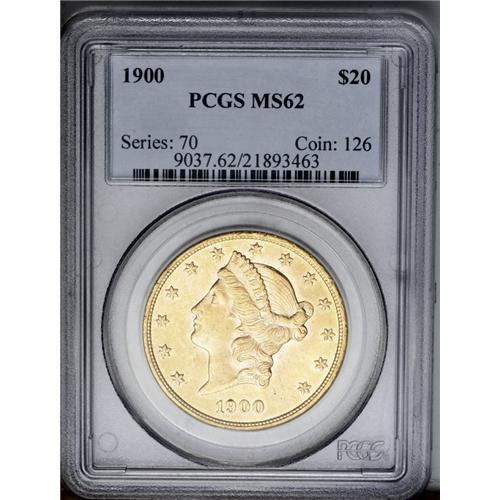 <B>1900<$20> MS62 PCGS.</B></I> A bright honey-gold piece that possesses the expected distributed marks expected of the grade. The 00 in the date is lightly repunched.