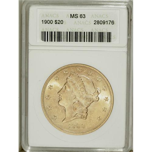 <B>1900 $20 MS63 ANACS.</B></I> The bright straw-gold surfaces have strong, radiant luster. Solidly struck, with some light obverse abrasions that preclude a finer grade.<BR><BR><b>Shipping:</b> Coin/Currency (<a target="_blank" href="http://www.heritageauctions.com/common/shipping.php">view shipping information</a>)