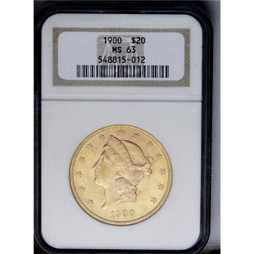 1900 $20 MS63 NGC. Nicely struck, with lustrous green- 1900