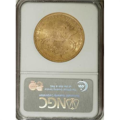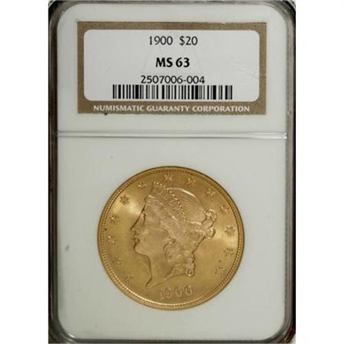 <B>1900 $20 MS63 NGC.</B></I> NGC Census: (9301/3102). PCGS Population (6956/2769). Mintage: 1,874,584. Numismedia Wsl. Price for NGC/PCGS coin in MS63: $920. (#9037)<BR><BR><B>Coin Engraver:</B> James B. Longacre<BR><BR><b>Shipping:</b> Coins & Currency (<a target="_blank" href="http://www.heritageauctions.com/common/shipping.php">view shipping information</a>)