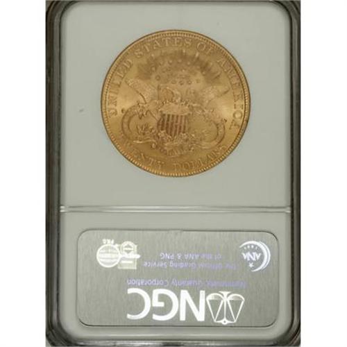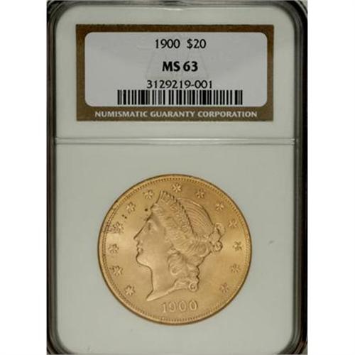 <B>1900 $20 MS63 NGC.</B></I> NGC Census: (9474/3156). PCGS Population (7199/2876). Mintage: 1,874,584. Numismedia Wsl. Price for NGC/PCGS coin in MS63: $1,400. (#9037)<BR><BR><B>Coin Engraver:</B> James B. Longacre<BR><BR><b>Shipping:</b> Coins & Currency (<a target="_blank" href="http://www.heritageauctions.com/common/shipping.php">view shipping information</a>)