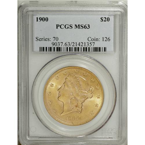 1900 $20 MS63 PCGS. This Philadelphia Mint issue is ch