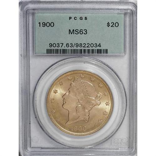 <B>1900 $20 MS63 PCGS.</B></I> A solid strike leaves sharp definition on the design features of this Select double eagle, and dazzling luster issues from green-gold surfaces. A few trivial marks define the grade. Housed in a green-label holder.<BR><I>From the Reuben Reinstein Collection.</B></I><BR><BR><b>Shipping:</b> Coins & Currency (<a target="_blank" href="http://www.heritageauctions.com/common/shipping.php">view shipping information</a>)